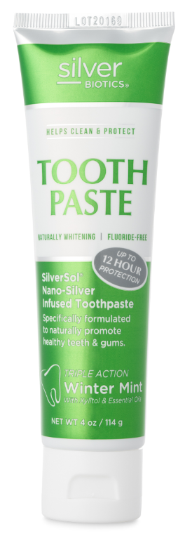 20ppm SilverSol Solution (deionized water‚ purified silver)‚ Calcium Carbonate (natural mineral)‚ Glycerin (vegetable source)‚ Xylitol (vegetable source)‚ Coconut Oil‚ Sodium Bicarbonate (baking soda)‚ Coco Betaine (foaming agent from coconut)‚ Hydrated Silica‚ Natural Flavors (essential oil blend)‚ Xanthan Gum‚ Stevia (Stevia rebaudiana).
