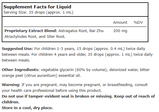 Suggested Use: For children 1-3 years, 15 drops (approx. 0.4 mL) twice daily between meals. For children 4 years and older, 35 drops (approx. 1 mL) twice daily between meals.
