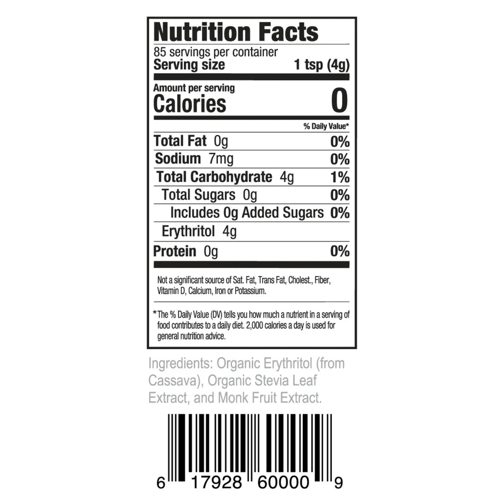 Nutrition Facts: 85 servings per container; Serving size: 1 tsp (4g); CALORIES 0; TOTAL FAT, 0g: 0%; SODIUM, 0mg: 0%; TOTAL CARBOHYDRATE 4: 1%; Total Sugars 0g: 0% Includes 0g Added Sugars 0% Erythritol 4g; PROTEIN, 0g: 0%.